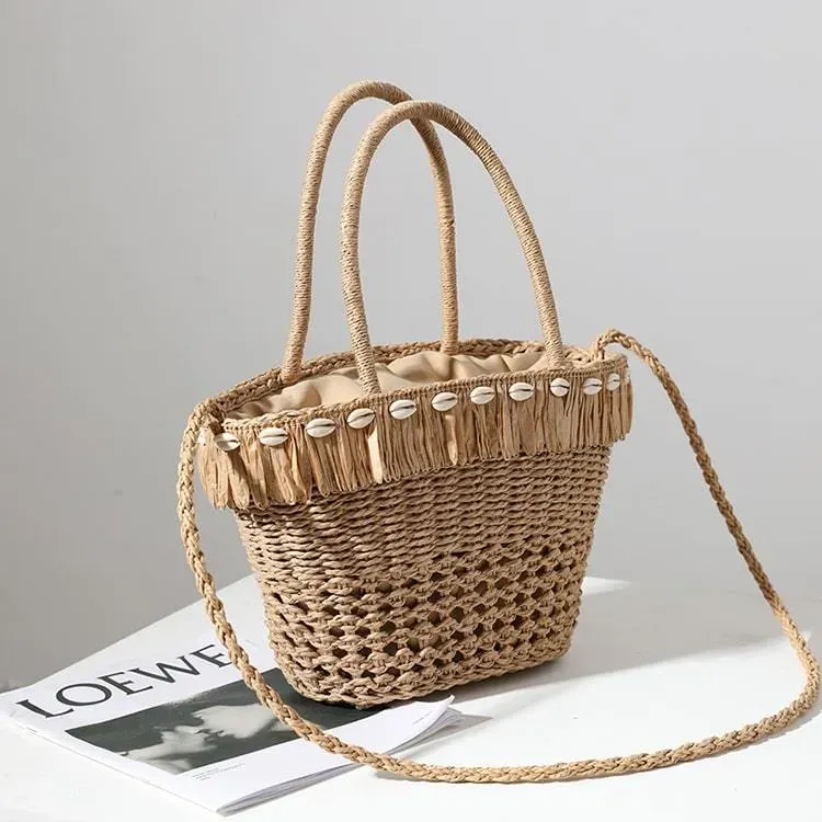 Women Vacation Style Tassels Shell Decoration Straw Woven Handle Bag