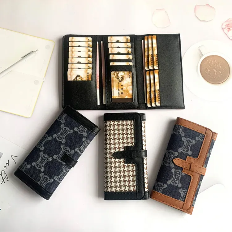 Women’S Fashion Pu Leather Embroidery Thread Solid Color Large Capacity Long Coin Purse