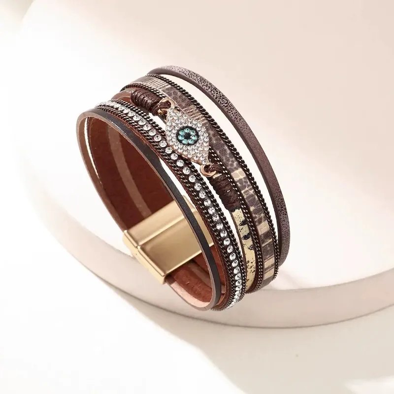 Wholesale Women Fashion Multi-Layer Leather Rhinestone Devil’S Eye Bracelet