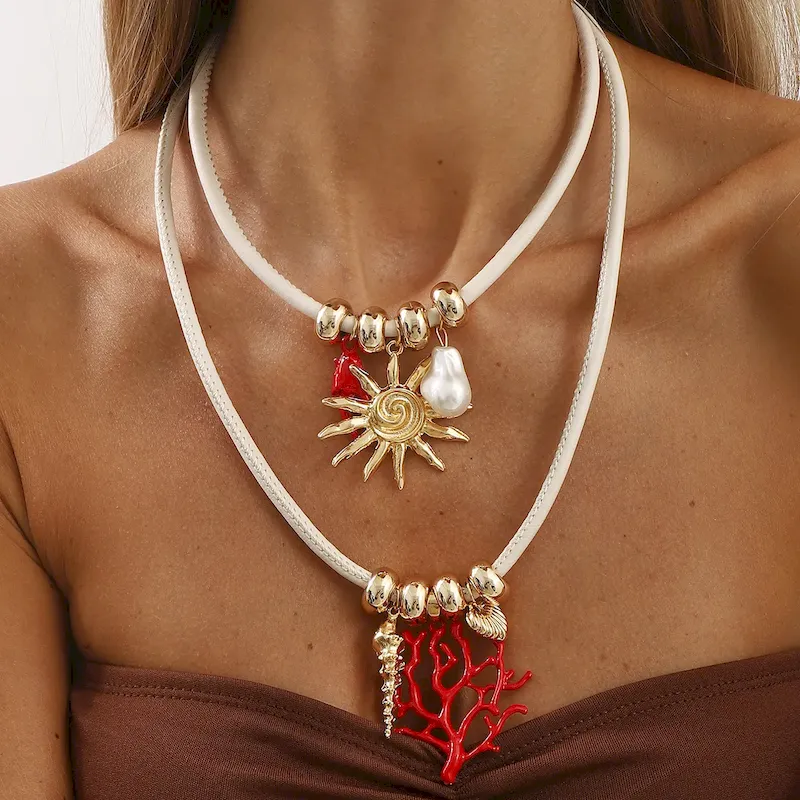 Wholesale Women Fashion Casual Beach Sun Coral Double Layer Leather Rope Necklace
