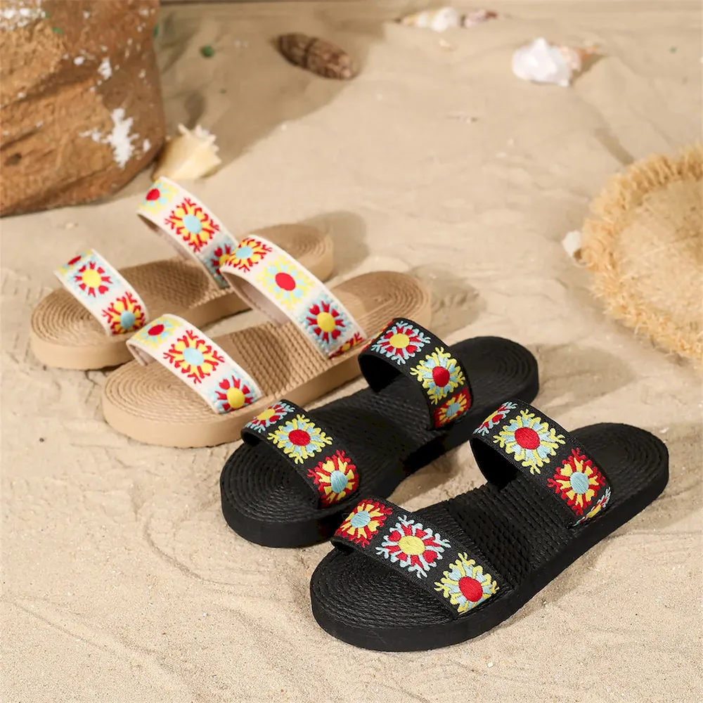 Summer Women Boho Ethnic Vintage Floral Flat Slippers