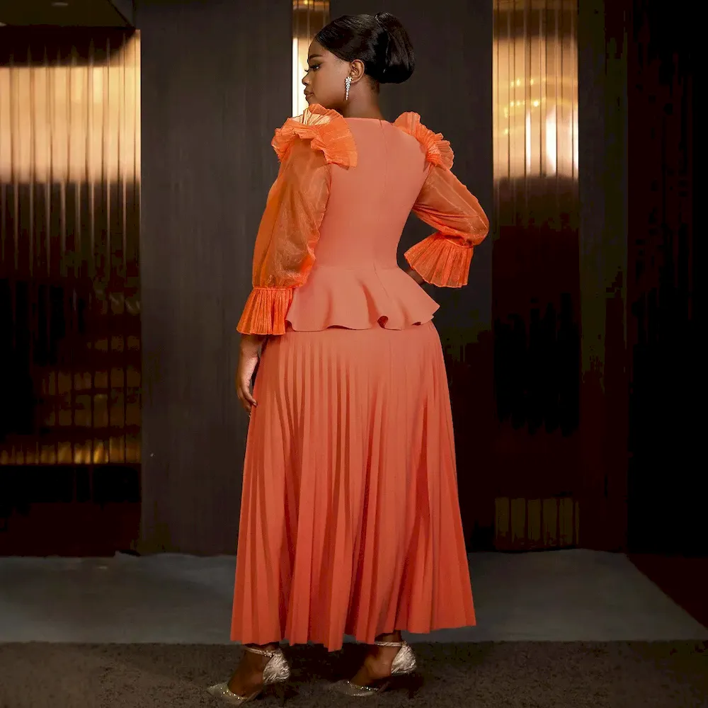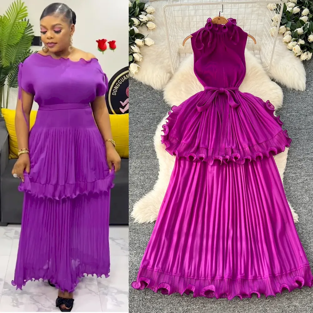 African Women Summer Pleated Ruffled Elegant Chic Solid Color Maxi Dress