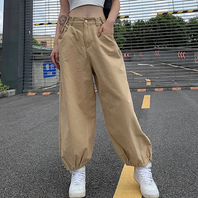 Women Khaki Strappy Overalls Loose Straight Casual Wide-Leg Jogger Pants