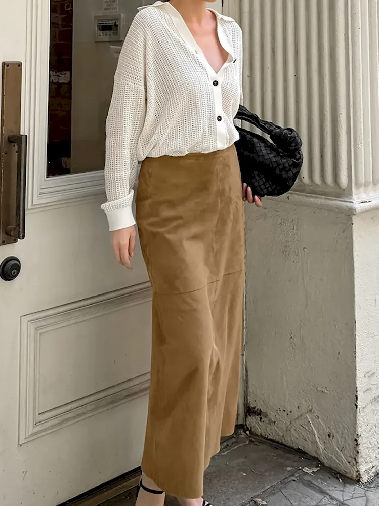 Women Fashion Casual Solid Color High Waist Pocket Slim A- Line Skirt