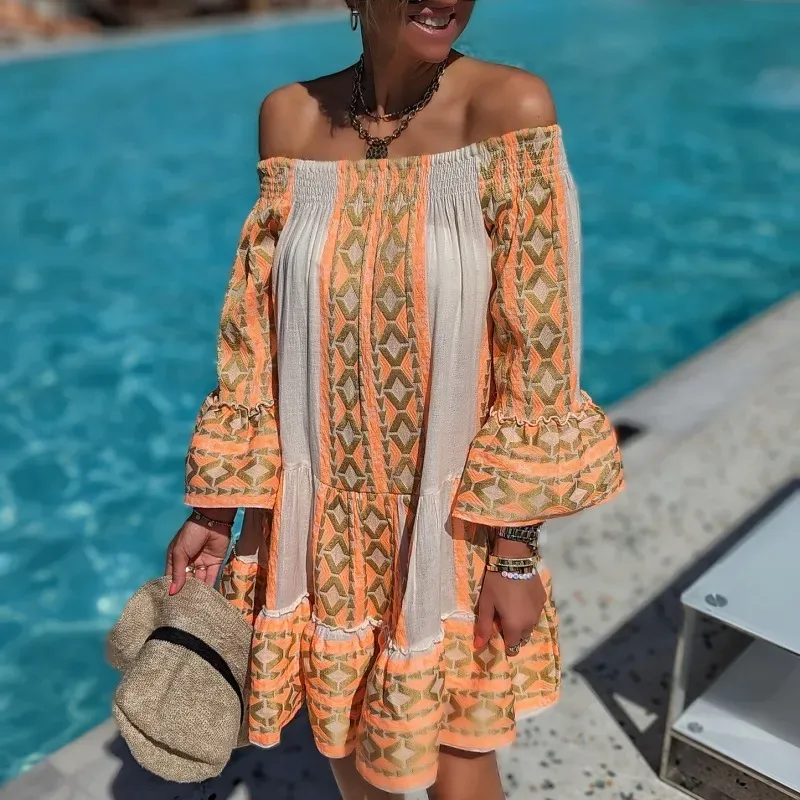 Summer Women Sweet Ruffled Off-Shoulder Long Sleeve Loose Dress