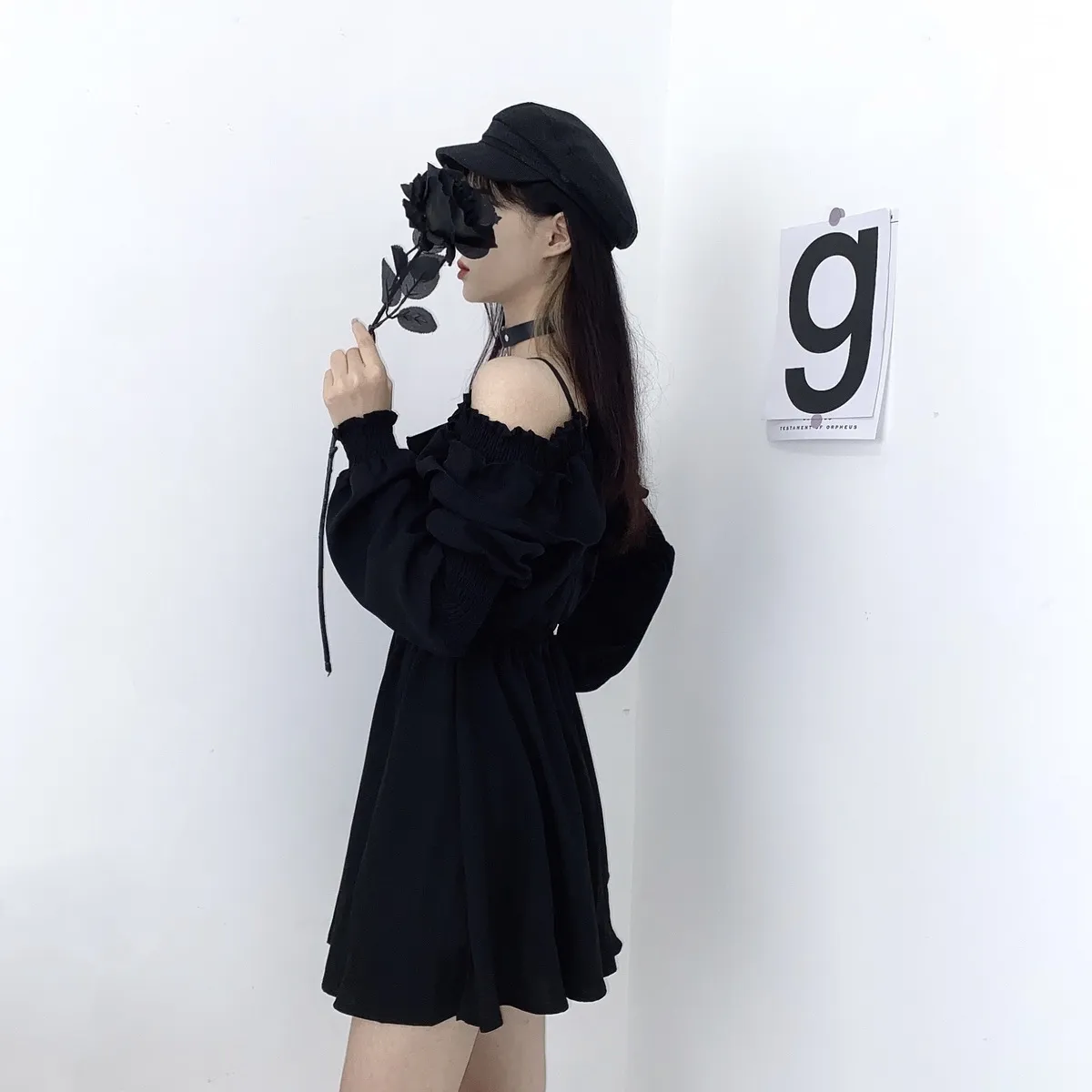 Women Fashion Sexy Black Ruffled Irregular Off-Shoulder Dress