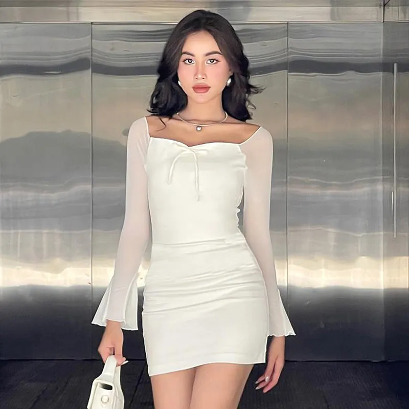 Women Nightclub Fashion Sexy Solid Color Off Shoulder Long Sleeve Bow Decorative Mini Dress