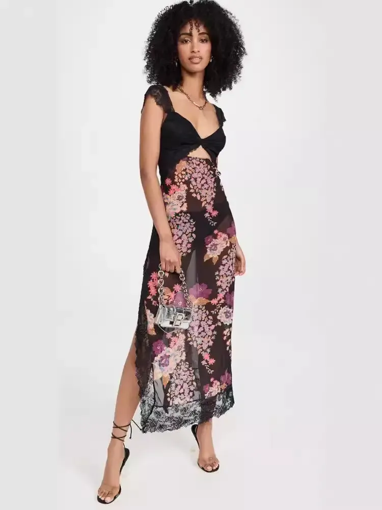 Women Fashion Sexy Lace Stitching Hollow-Out Sleeveless Backless Split Dress