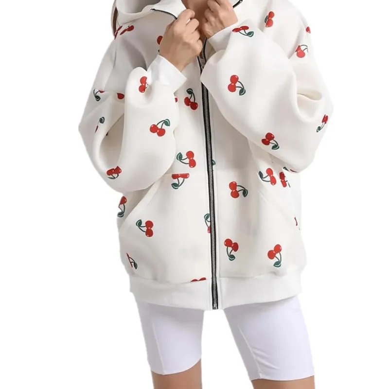 Cherry Printed Women Street Fashion Loose Sports Zipper Hoodie