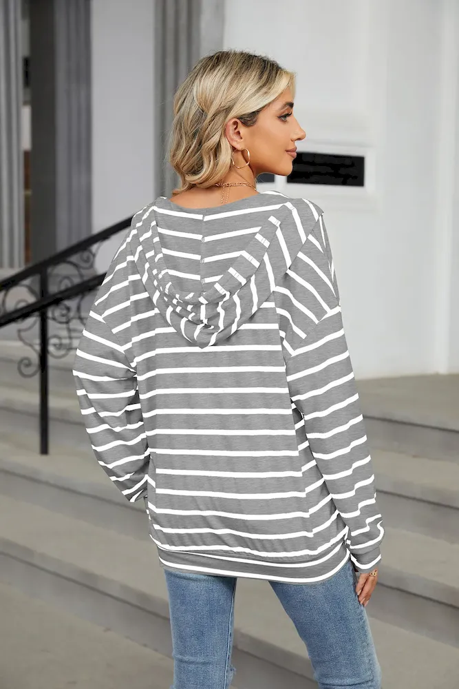 Women Fashion Casual Stripe V-Neck Long Sleeve Loose Hoodies