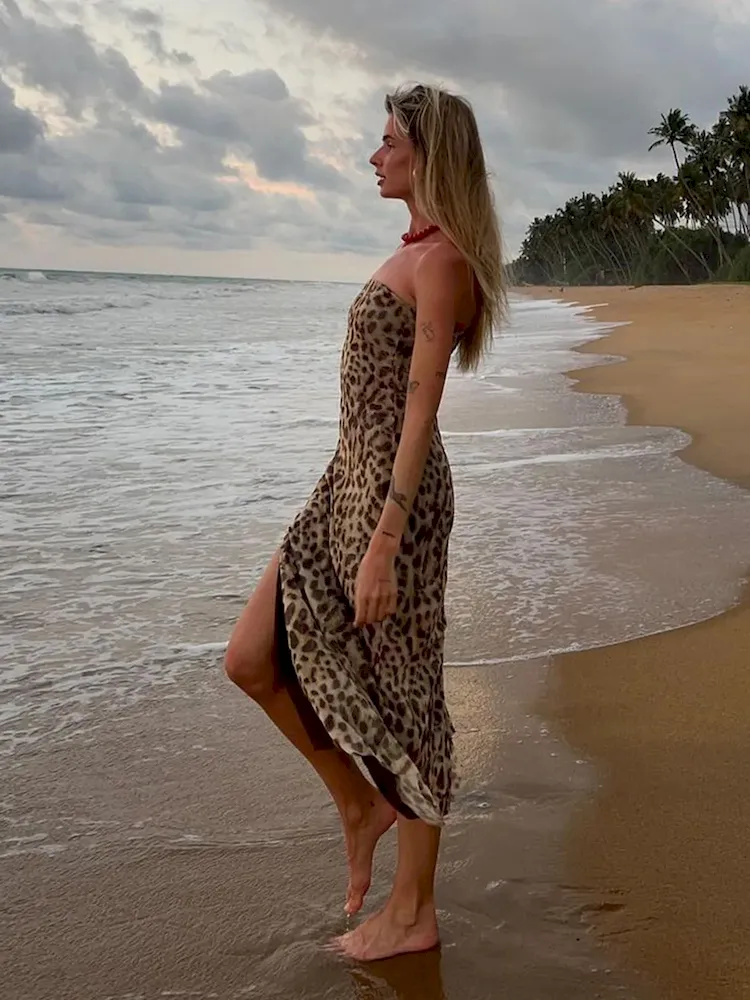 Women Summer Leopard Printed Sexy Strapless Side Slit Tube Dress