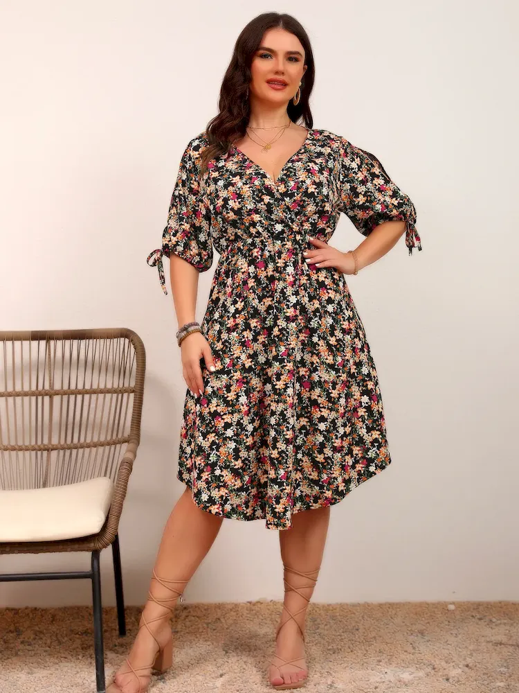 Women Fashion Elegant Plus Size Floral Printed V-Neck Drawstring Short-Sleeve Dress
