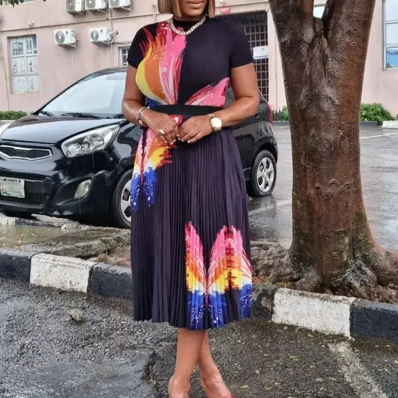 Women Fashion Plus Size Multicolor Butterfly Printed Short-Sleeved Top Pleated Skirt Two-Piece Set