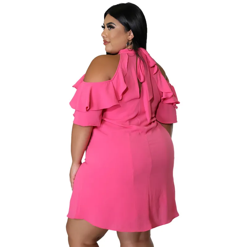 Women Fashion Sexy Solid Color Ruffled Cool-Shoulder Plus Size Dress