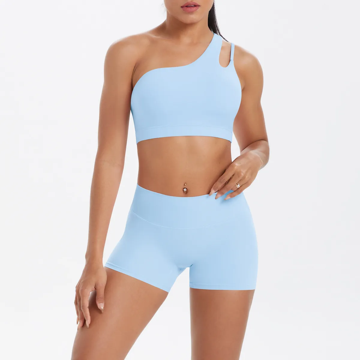 Women Fashion Casual Solid Color Slanted Shoulder Tank Top Tight Shorts Yoga Sports Two-Piece Set