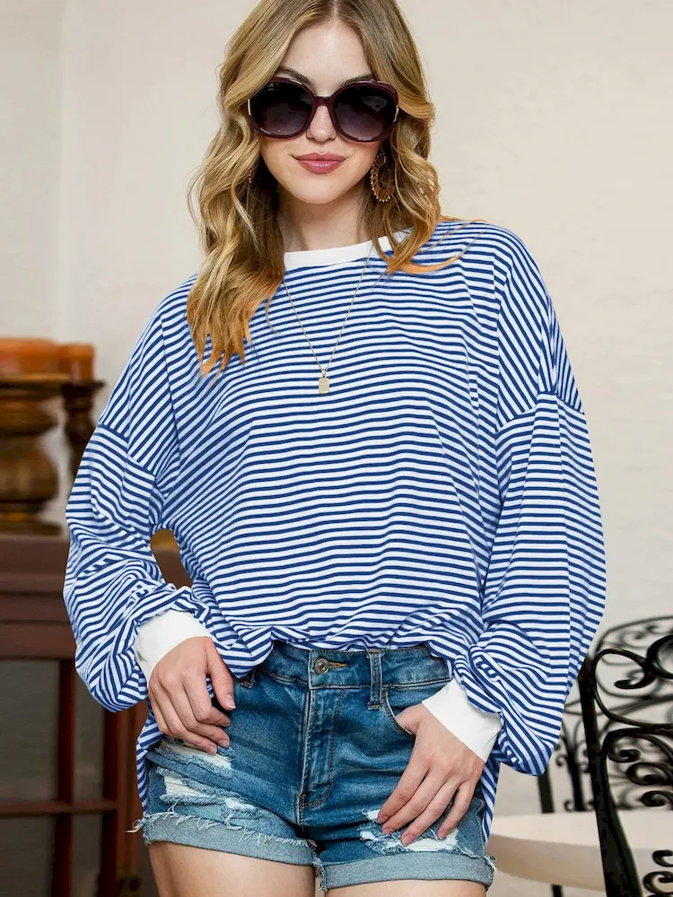 Women Fashion Casual Stripe Print Crewneck Long Sleeve Sweatshirt