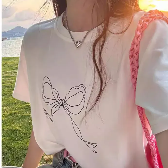 Women Fashion Casual Bowknot Printed Short-Sleeve Loose T-Shirt