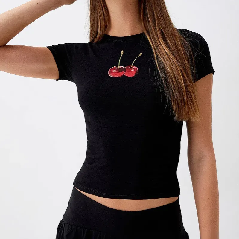 Women Fashion Casual Cherry Printed Round-Neck Short-Sleeve T-Shirt