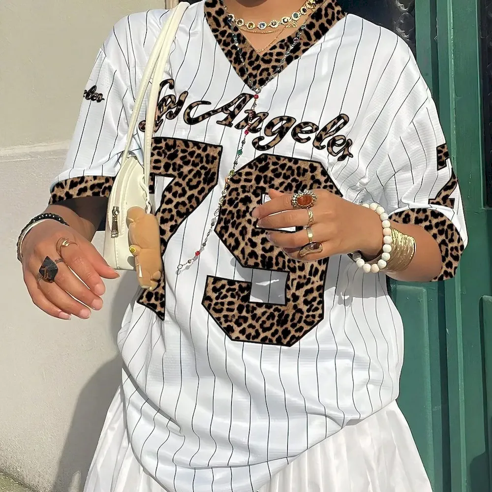 Women Fashion Casual Digital Printed V-Neck Short Sleeve Loose Jersey T-Shirt