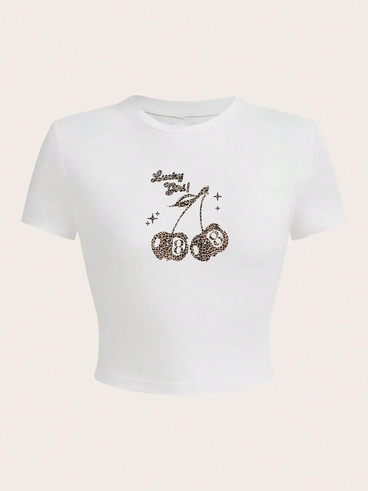 Women Fashion Leopard Cherry Print Short Sleeve Cropped Top Tee