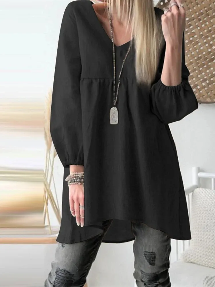 Women Casual Solid Color V-Neck Puff Sleeve Shirt Top