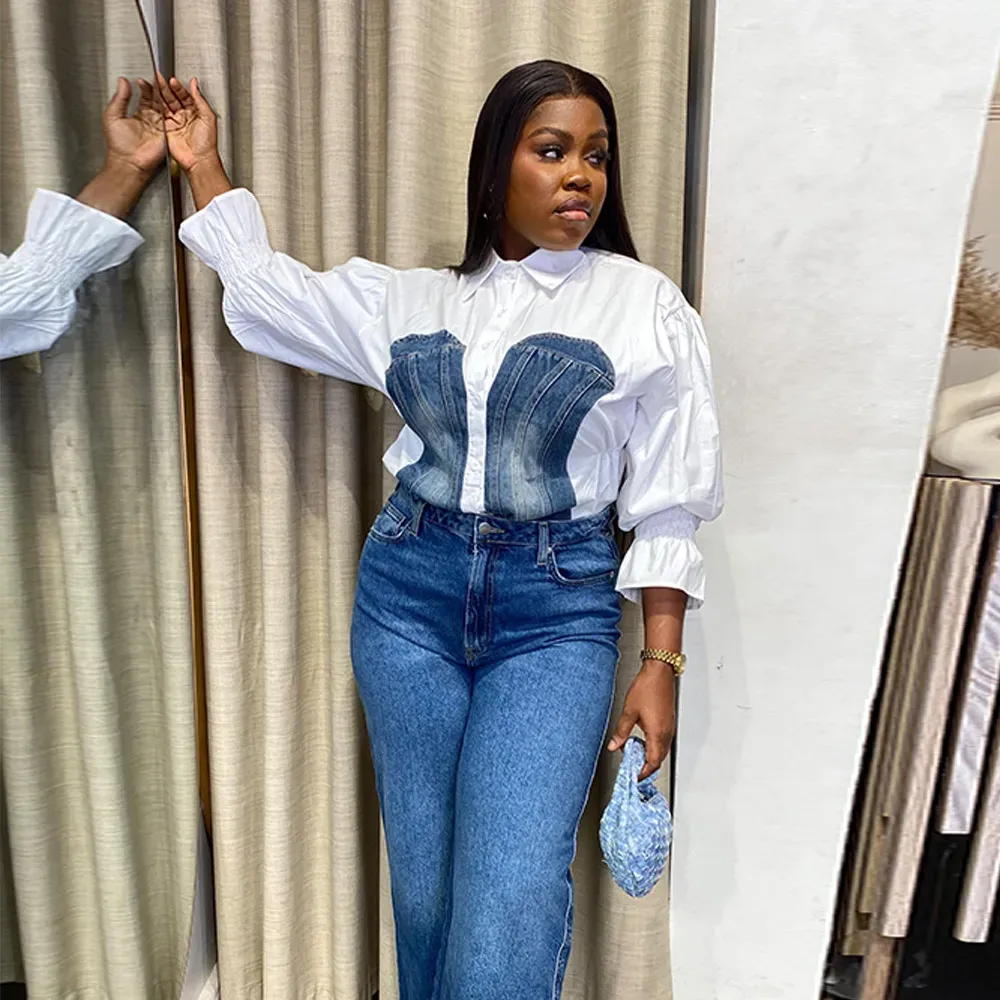 Women Fashion Denim Patchwork Horn Sleeve Crop Shirt Top