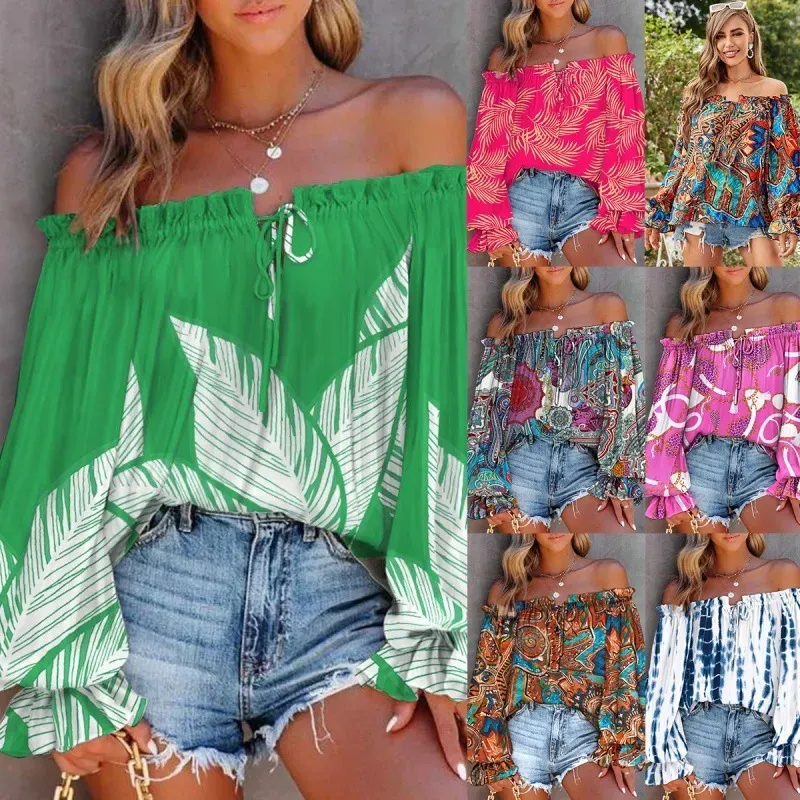 Women Fashion Sexy Graphic Printing Off Shoulder Long Sleeve Shirt Top