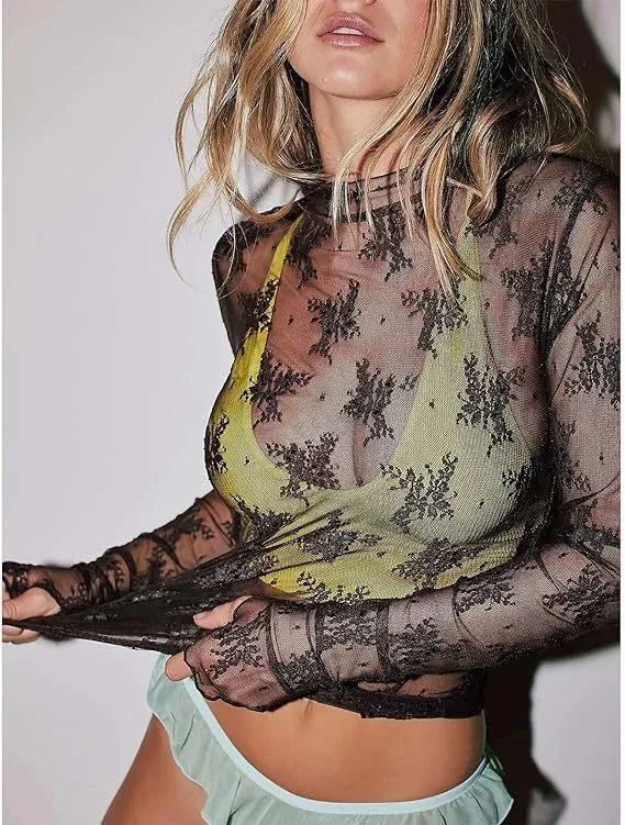 Women Fashion Sexy Lace Perspective Round Neck Long Sleeve Base Shirt
