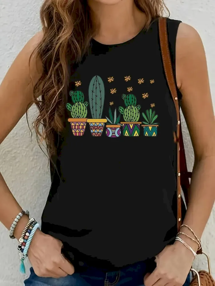 Women Fashion Casual Printed Round Neck Sleeveless Tank Top