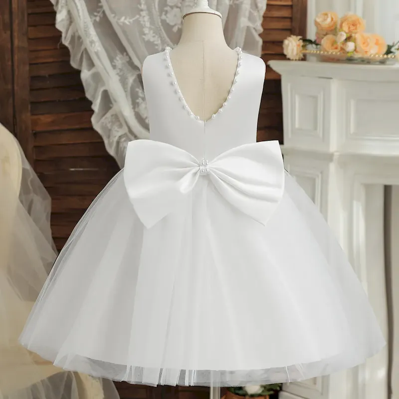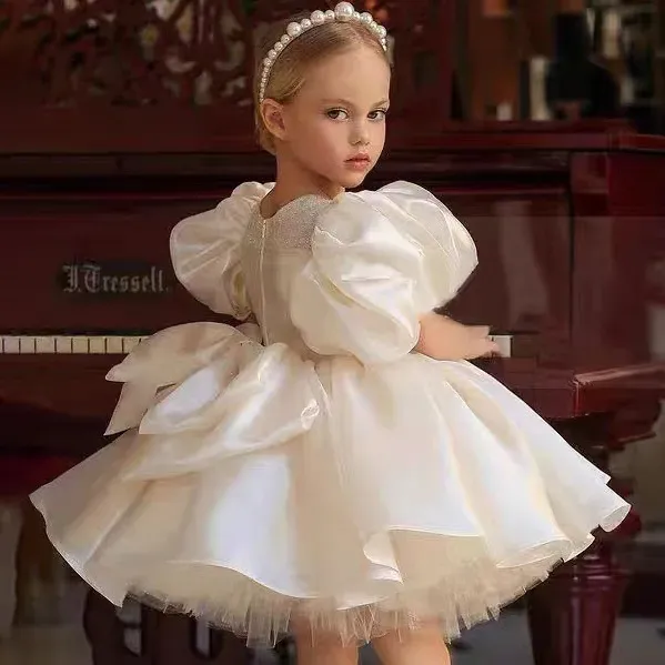 Wholesale Kids Girls Fashion Elegant White Satin Flower Puff Sleeve Party Princess Dress