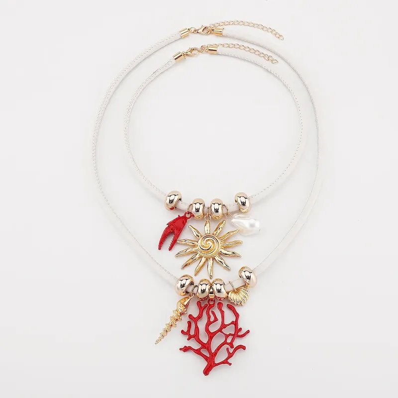 Wholesale Women Fashion Casual Beach Sun Coral Double Layer Leather Rope Necklace