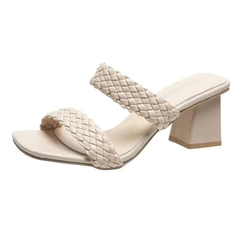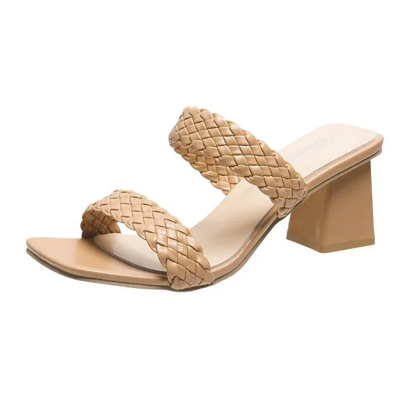 Women Fashion Solid Color Woven Belt Square Toe High Thick Heel Shoes